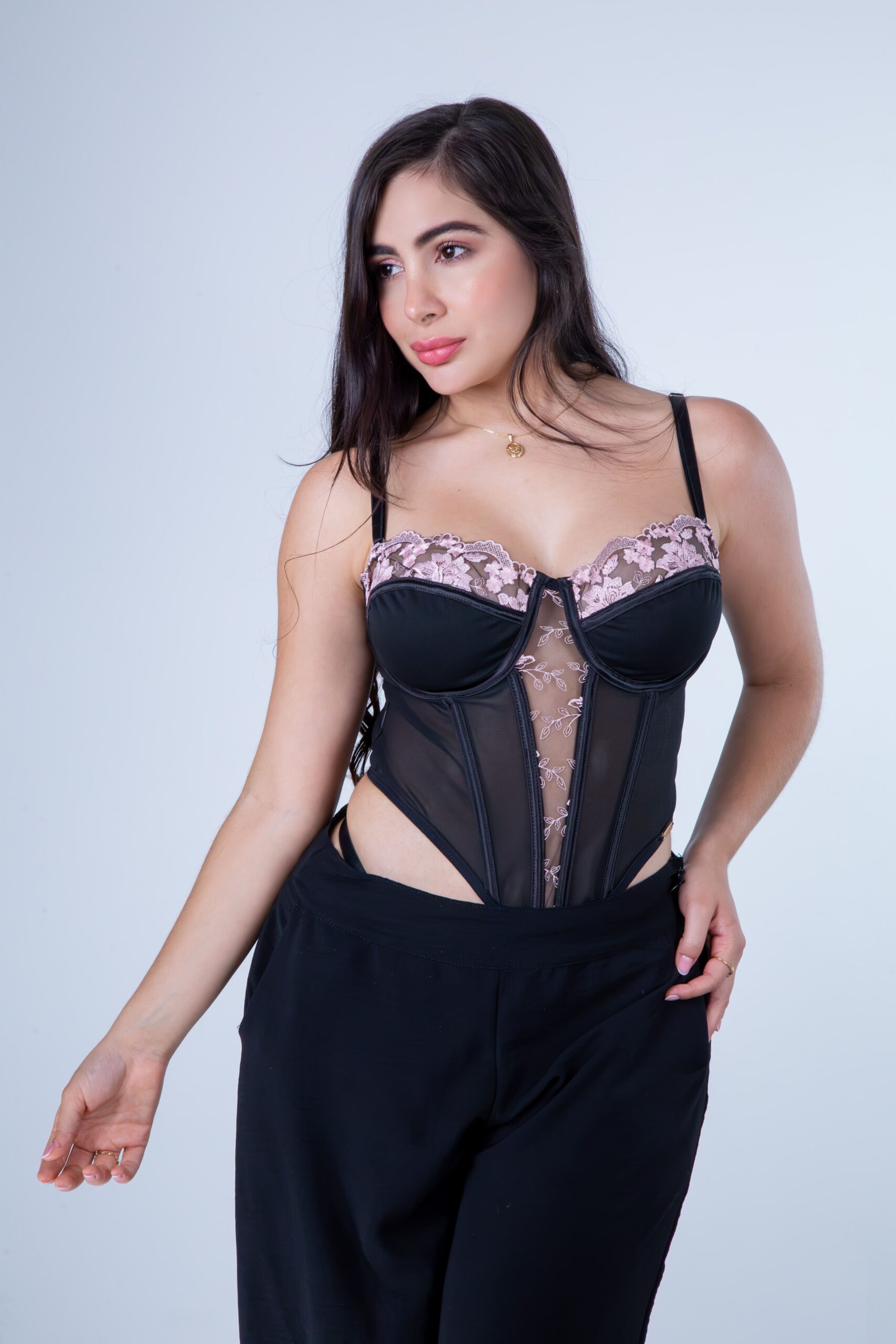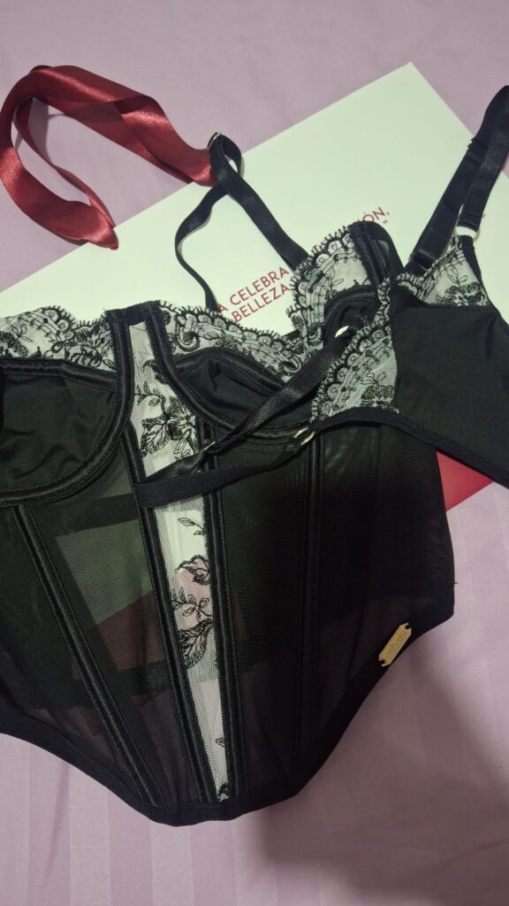 Éclat —que en francés significa “resplandor” o “destello”— es una oda a esa luz que surge cuando la mujer se siente plena, sin esfuerzo. Su diseño combina encaje bordado y transparencias que insinúan sin revelar del todo, creando un juego sutil entre delicadeza y poder.